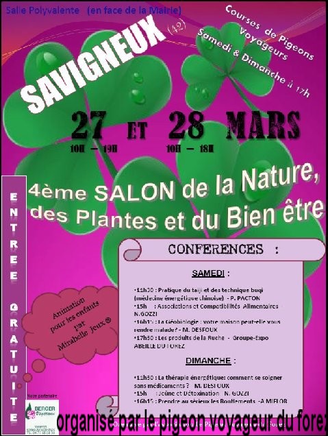 | bonsoir, la 4ème édition du salon de la nature aura lieu les 27 et 28 mars à Savigneux, salle polyvalente avec une course de pigeons voyageurs le samedi et une le dimanche 17h; https://upload.alloforum.com/23227/620J3VZO
