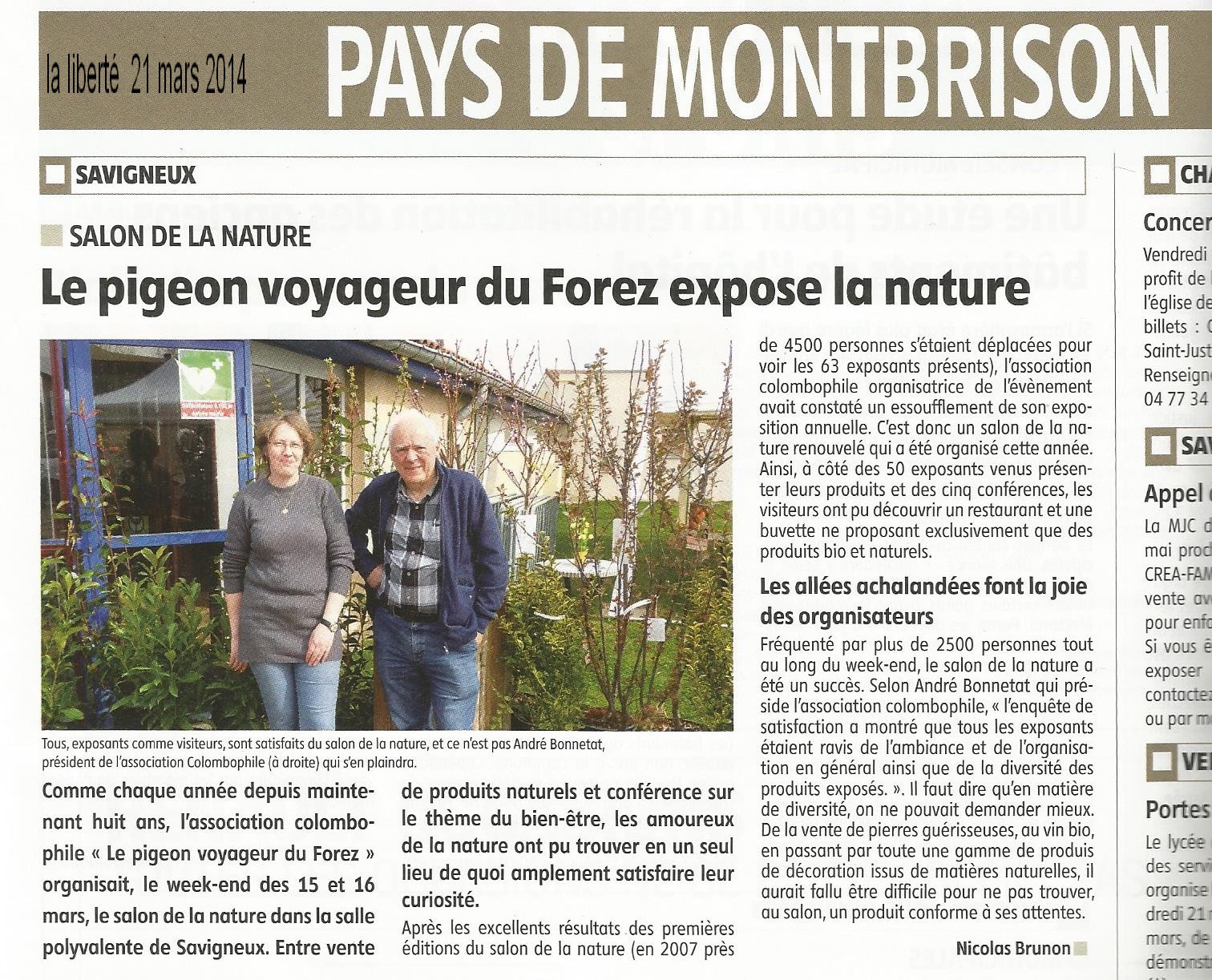 | Bonjour, le salon de la Nature et du Bien-Être 2014 aura lieu comme depuis 8 ans à la salle polyvalente de Savigneux les 15 et 16 mars. Déjà une vingtaine d'exposants ont donné leur accord ou sont déjà inscrits. Nous espérons que ce salon aura autant de succès que les premières années avec plusieurs milliers de visiteurs. Béatrice et moi-même prenons les inscriptions. Pour les amateurs de notre société, pensez à réserver votre week end du 15/16 mars. bonne journée à tous.