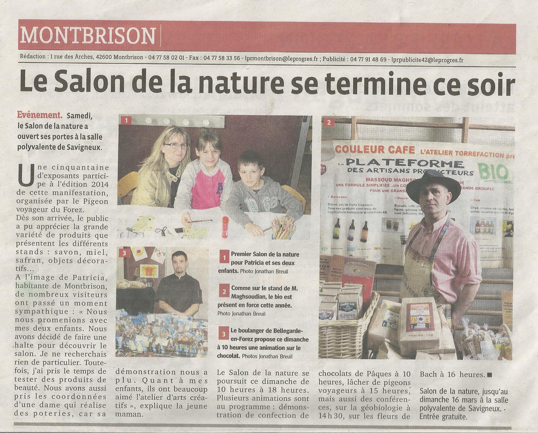 | bonjour, excellente participation des visiteurs et en plus les félicitations pour la diversité des exposants. également félicitations quant au nombre d'exposants bien axés BIO. déjà beaucoup d'exposants qui souhaitent revenir en 2015. tous ont apprécié le restaurant bio: docteur miamiam ainsi que la buvette bio; les enfants avaient leur coin loisirs créatifs que pour eux; beaucoup de travail pour l'organisation, mais aussi participation active des membres du PVF et grosse satisfaction; il faut noter aussi les félicitations pour la publicité faite autour du salon: les journaux comme la tribune, la gazette et la liberté ont mis des articles depuis 3 semaines, dont 2 cette semaine pour la tribune; les affiches mises chez tous les commerçants et village alentours et France Bleue St Etienne. Egalement sur tous les journaux bio comme biocontact et l'office de tourisme Montbrison, St Just et Chalmazel.